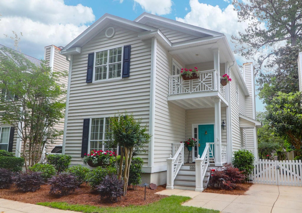 This inviting traditional home is located in Queens Row, just minutes from historic downtown Charleson and our beautiful beaches! The spacious great room with a gas fireplace opens to the dining area and conveniently laid out kitchen w/pantry. Step through the French doors onto the beautifully landscaped brick patio in the fully fenced back yard overlooking the pond. You will find 9' ceilings, crown molding, wainscoting, and hardwood floors throughout the first floor! Powder room, laundry center and home office/ separate dining room/ 4th bedroom also downstairs. Plantation shutters! This home boasts two primary ensuites with whirlpool tubs separate showers and walk-in closets. Upstairs porch off front primary bedroom. Central vac. Easy care yard; irrigation system and more.