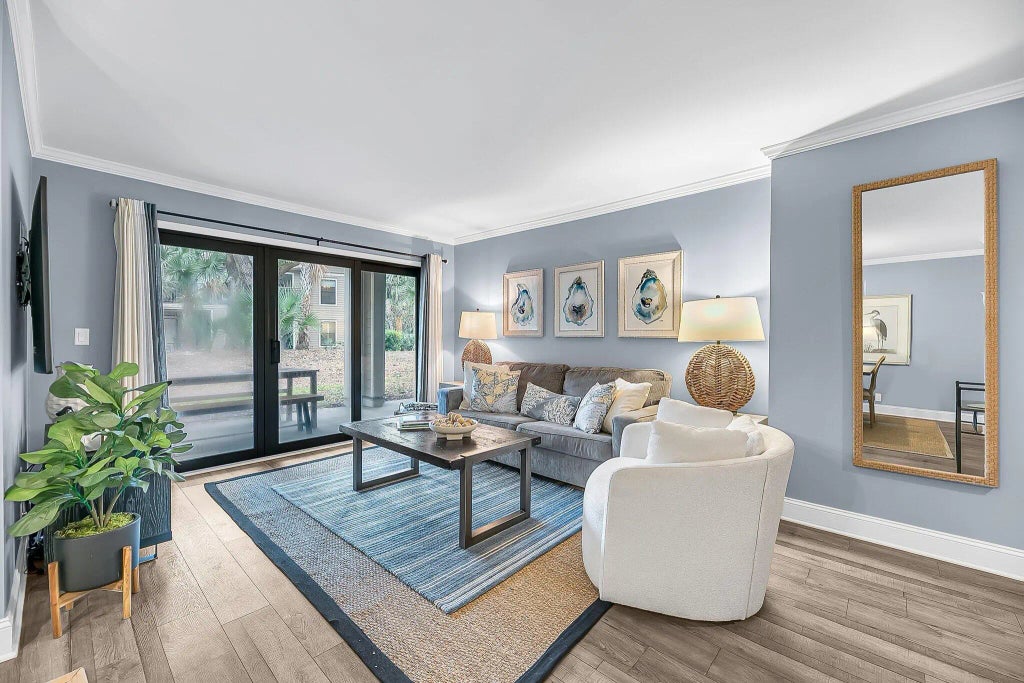 This beautifully renovated 2BR, 2BA High Hammock is a tastefully decorated first floor, end villa. Upgrades include luxury vinyl plank flooring throughout the living, dining, kitchen and bedrooms and retro black and white ceramic tile in the bathrooms and laundry room. The kitchen boasts new white shaker cabinetry with soft close drawers, granite countertops and stainless Whirlpool appliances.The living/dining area has sleek furnishings, lamps and light fixtures with access to the large patio. There you'll find plenty of room for seating and a large picnic table for al fresco dining. A nice wooded view to the golf course beyond makes this the perfect spot for coffee in the morning or your favorite beverage in the afternoon. The villa has new windows, sliders and doors throughout.Both baths have been totally renovated with black and white tiled showers, black vanities and granite countertops. This move-in ready villa is designer finished with lovely art, window treatments and warm neutral colors. It's close enough to walk or ride your bikes to the beach and all of the amenities Seabrook has to offer. This property has a superior rental history though looking at its condition; you'd never know it. Probably the highest rental revenue to purchase price ratio on the Island. Have your agent inquire for rental revenue numbers. If you've been looking for a High Hammock Villa or other 2BR, 2BA villa on Seabrook; this is the one. Sold completely furnished; just bring your toothbrush.
