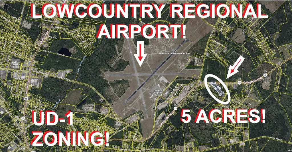 ATTENTION BUSINESS OWNERS / INVESTORS / DEVELOPERS!! --- OVER 5 ACRES!! **HIGH AND DRY LAND READY FOR DEVELOPMENT!! **** Right around the corner from the LOWCOUNTRY REGIONAL AIRPORT!!! --------------THE SKY IS THE LIMIT HERE!! ------------ ZONING allows for almost anything! ------------------ See attached Permitted Uses for ZONING UD-1 --------------- (Large variety of Commercial, Multi-Fam, Rentals & Residential Development!) ****At this price, a short-term investment will pay for itself!! HURRY!! **(SEE MORE) --- GO & SHOW - NO APPT NECESSARY
