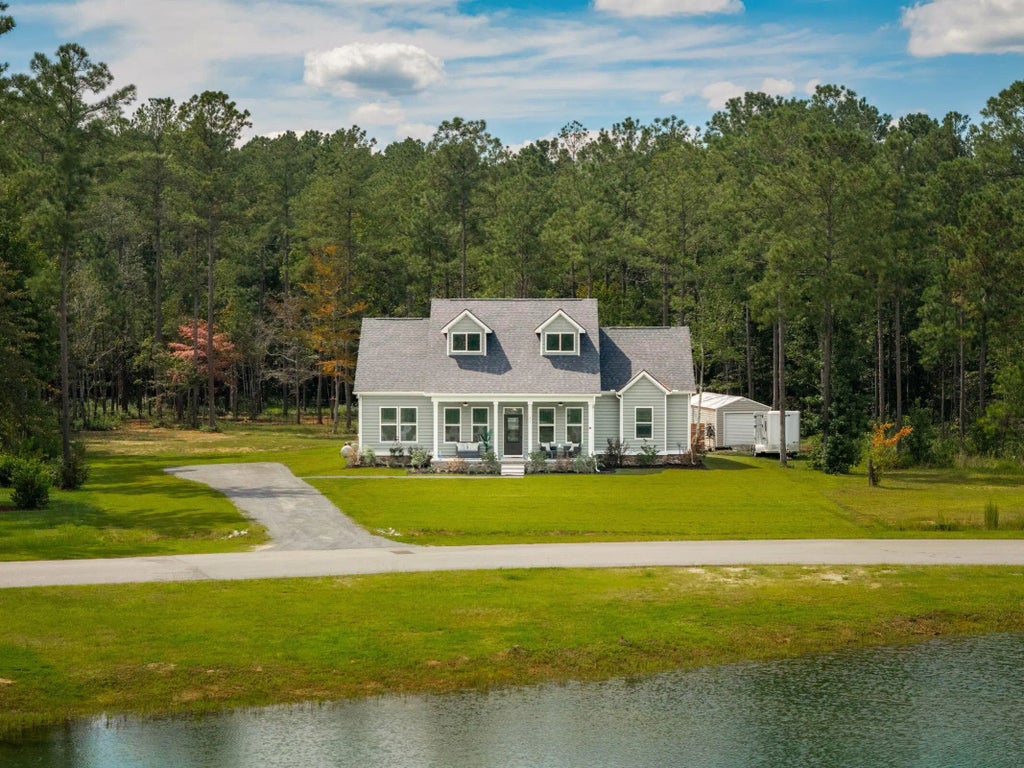 If you want to live a slower paced life in the country this is it!2023 build on 5.3 acres! 3 bedroom 2 bath impeccably maintained house with pretty views of the lake. The 312 sq. foot sunroom was added this year and is not included in total sq. feet of the house. The house has an open floor plan, huge kitchen with granite island and counters. Office space, large master bedroom/bathroom. Lots of storage! With over 5 acres there are many options for your outdoor use and enjoyment! Lake in front of house is stocked for fish! This new low density neighborhood only 9 traffic free miles from the Mt Pleasant Lowes and Harris Teeter. Horses are welcome and have access to miles of trails and thousands of acres in the nearby Francis Marion National Forest. Separate climate controlled shed conveys.