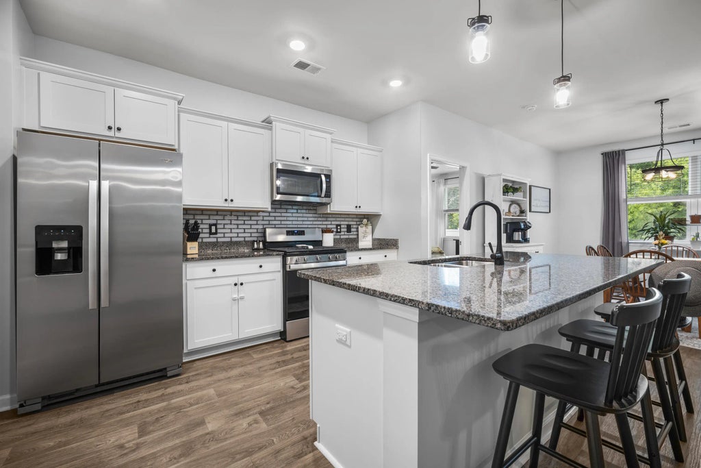 The heart of the home is the expansive granite-covered chef's kitchen, anchored by a stunning oversized island that commands attention. Stainless steel appliances to include a gas range and a new dishwasher. To complete the design, you will enjoy a classic subway tile backsplash, updated lighting, and sleek modern cabinet hardware.((