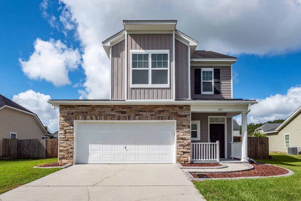 Pristine and ready for its next lucky buyers! A charming covered front porch welcomes you into this inviting home. The open-concept main level features a spacious living and dining area that flows seamlessly from the large kitchen with an abundance of counter space and cabinetry. A double-door pantry and generous eat-in area offer both convenience and functionality, while the breakfast bar comfortably accommodates room for four barstools-perfect for casual dining or entertaining. The home's neutral palette throughout provides a fresh, move-in ready feel.Upstairs you will find the spacious primary suite offering a respite from the stresses of the day. Completing the upstairs level are an additional two bedrooms, a full bathroom, spacious laundry room and linen closet. Enjoy the greatoutdoors in your fully fenced backyard. Epoxy garage floor provides a smooth and easy to maintain surface. Community pool, playground, trails, ponds and RV/Boat storage. Close to Naval Weapons Station and Joint Base Charleston as well as dining, shopping, downtown Charleston and area beaches.